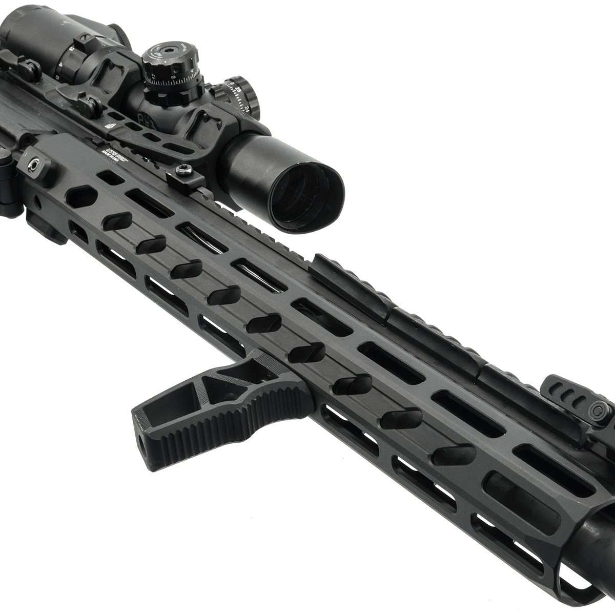 Ett vertikalt grepp är ett av de vanligaste tillbehören till karbiner, eftersom det ökar kontrollen över vapnet och gör det lättare att manövrera. Leapers Super Slim M-LOK är tillverkat av 6061-T6 flygplansaluminium och ytbehandlat med en mycket slitstark anodisering.